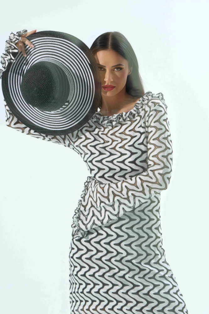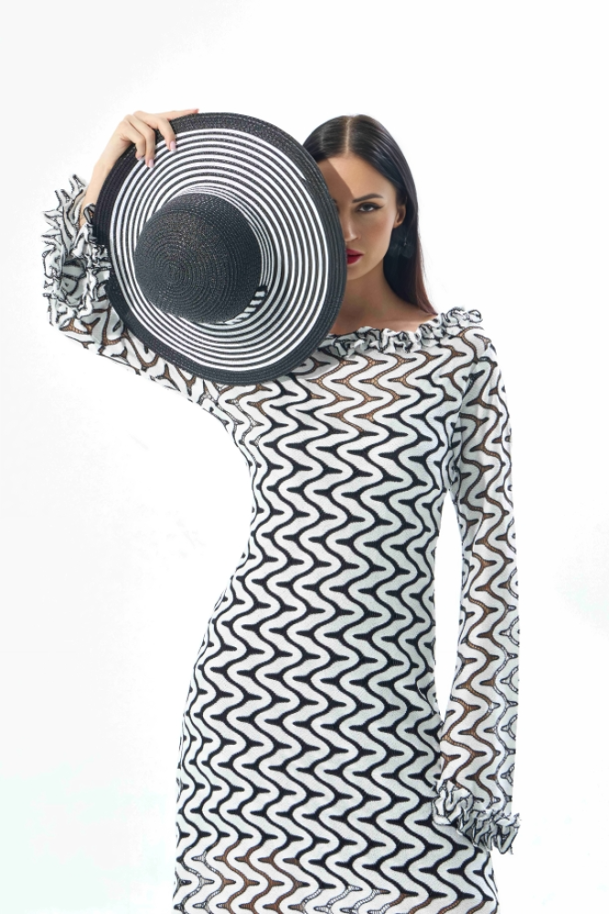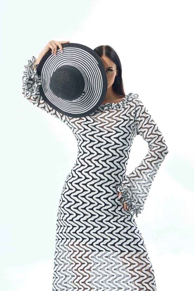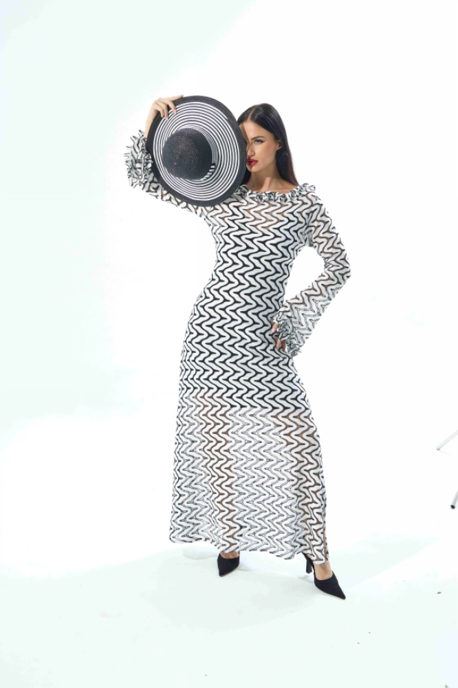 - يتميز فستان نسائي طويل بتصميم راقٍ يجمع بين اللونين الأبيض والأسود في توازن مثالي يبرز أناقتك بكل بساطة.